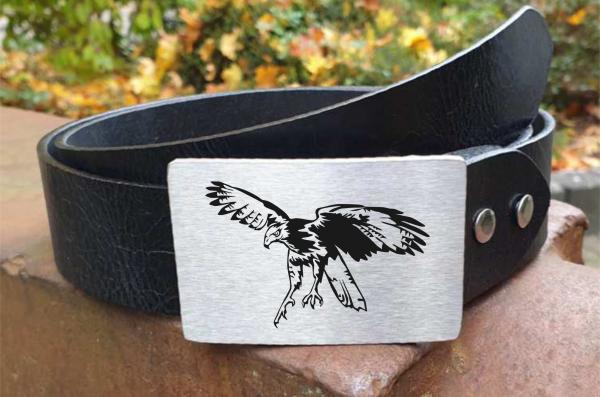 Massive Gürtelschnalle aus Edelstahl, gebürstet, graviert mit der Grafik eines Adlers.