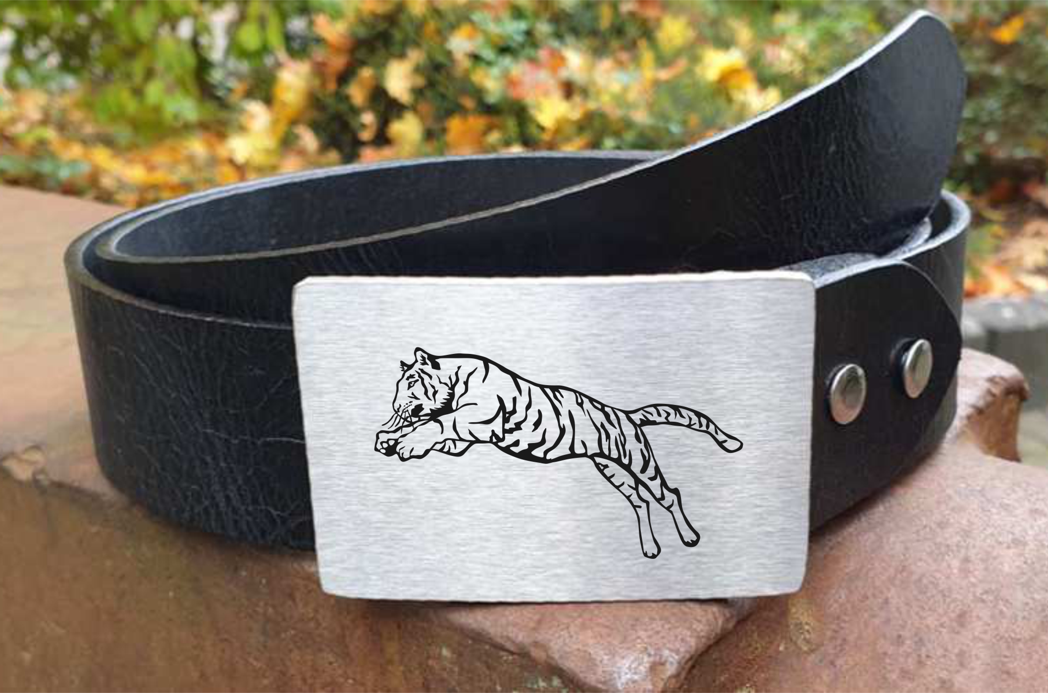 Massive Gürtelschnalle aus Edelstahl, gebürstet, graviert mit der Grafik eines Tigers.